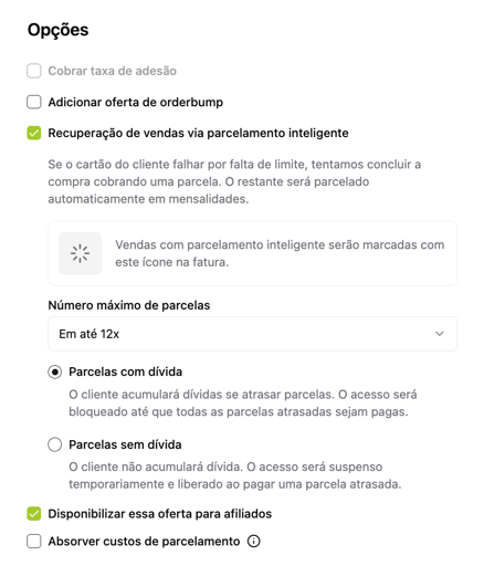 Para ativar, basta selecionar a opção Recuperação de vendas via parcelamento inteligente dentro da edição da oferta. Assim, quando uma compra for recusada por falta de limite, faremos automaticamente uma nova tentativa cobrando apenas a 1ª parcela.