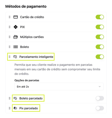 Pronto! Os métodos de pagamento associados ao Parcelamento já ficarão disponíveis no seu checkout.