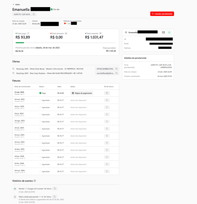 Clicando na venda desejada é possível ver todos os detalhes da compra, como status do Parcelamento Inteligente (em dia, cancelado ou atrasado), as parcelas vigentes e quantidade total de parcelas, as parcelas agendadas, e o botão “Cancelar Parcelamento”, que inativa todas as parcelas agendadas (não implica no reembolso de parcelas já pagas, caso queira reembolsá-las precisará fazer isso clicando diretamente na fatura).