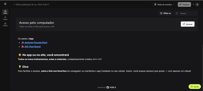 - Entenda que o acesso é feito fora da Hubla (área externa).