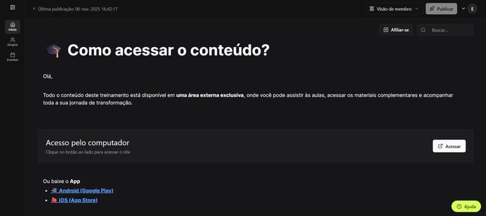 Quando o conteúdo do produto é oferecido fora da Hubla (site, app próprio, comunidade externa, plataforma de aulas de terceiros etc.), a área de membros deve funcionar como um ponto de orientação para o aluno.